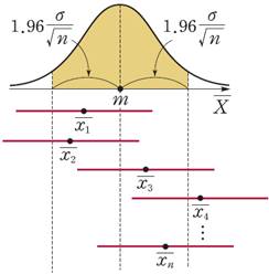 가 달라지고 신뢰구간도 달라진다. 이 신뢰구간 중에는 그림과 같이 모평균 m을 포함하는 것과 포함하지 않는 것이 있을 수 있다.