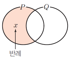 p, q의 진리집합을 각각 P, Q라 할 때 반례는 P-Q의 원소이다.