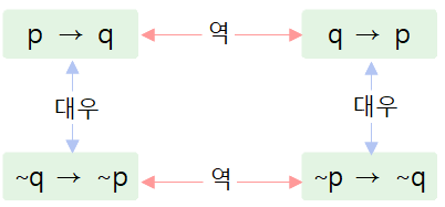 명제 p → q가 참이면 그 대우 ∼q → ∼p도 참이다.