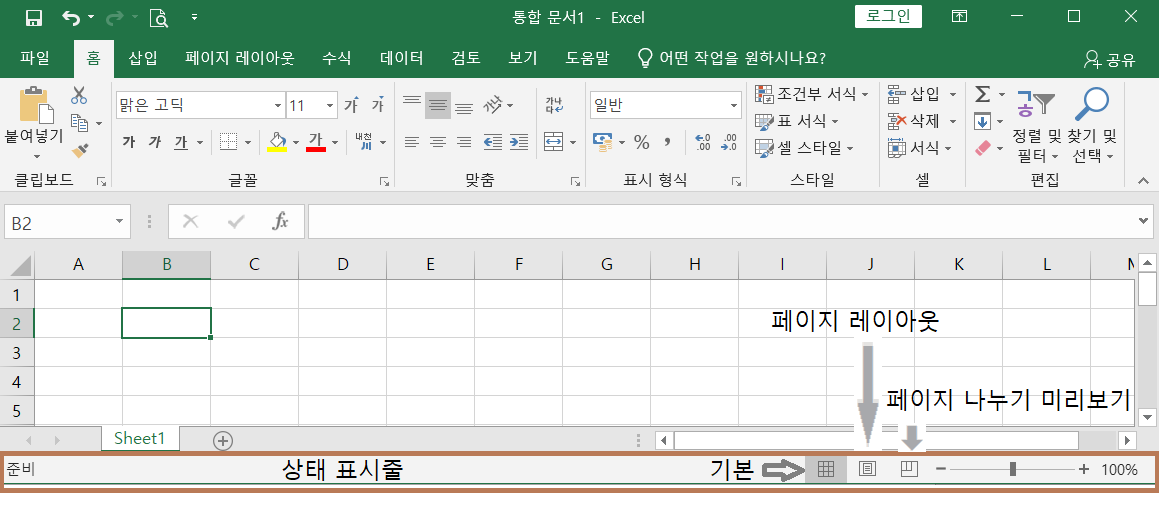 기본적인 화면 표시는 기본, 페이지 레이아웃, 페이지 나누기 미리보기 3가지 형태중 선택가능