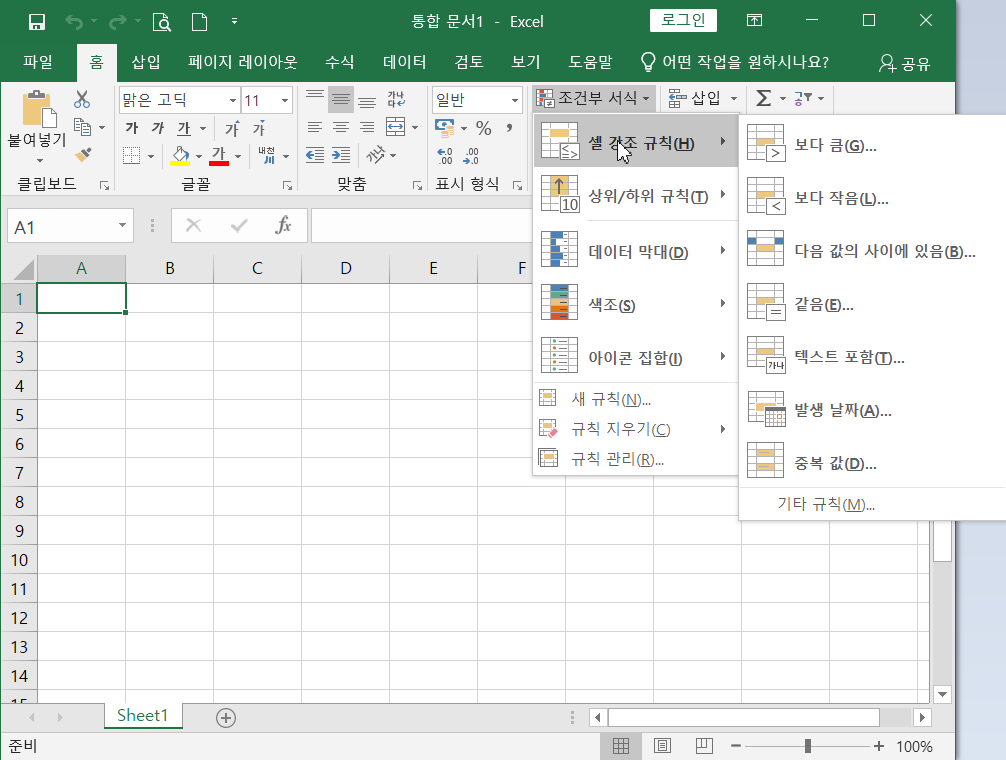 (1) 셀 강조 규칙 : 특정 범위의 값 등을 찾아서 셀이 강조되어 보이게 하는 규칙