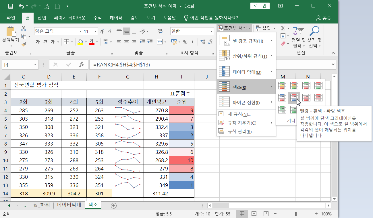 숫자값이 큰 수부터 작은 것 순서로 색조를 적용해 보자. 순위를 모두 선택한 다음(I4:I13) 리본메뉴 [홈]탭에서 [스타일]그룹 - [조건부 서식]-[색조]-[발강-흰색-파랑 색조] 을 클릭하면 순서대로 색상이 적용됨.