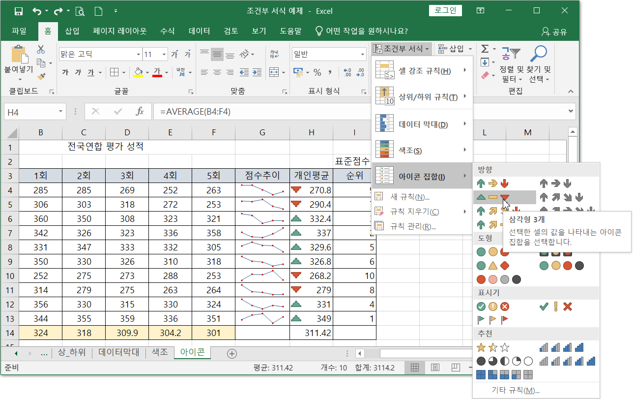 아이콘으로 셀 값을 표시해보자. 개인 평균값을 모두 선택하고(H4:H13) 리본메뉴 [홈]탭에서 [스타일]그룹 - [조건부 서식]-[아이콘 집합]-[방향]-[삼각형 3개]을 클릭하면 선택영역 안에서 평균값보다 높으면 ▲, 같으면 -, 낮으면 ▼ 으로 표시됨.
