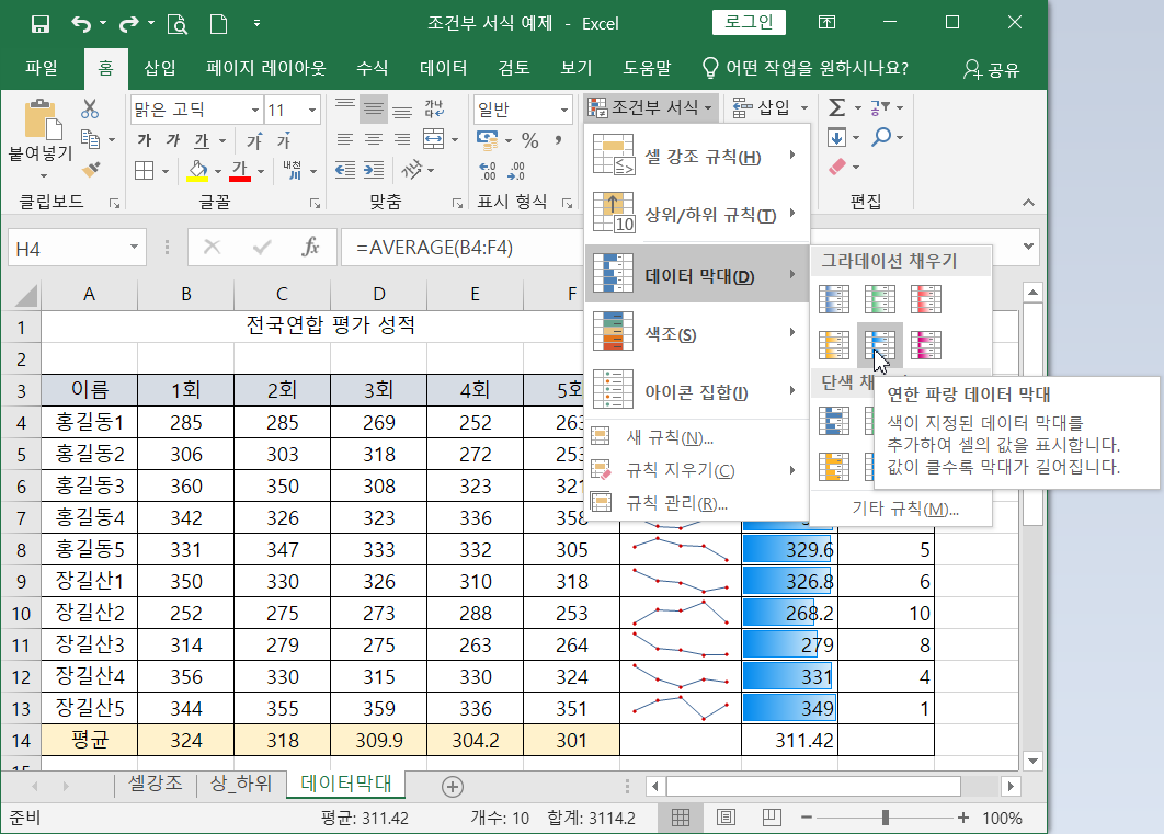 개인 평균값들의 데이터 막대를 적용하여 보자. 먼저 개인 평균값들의 영역을 선택한 다음 (H4:H13) 리본메뉴 [홈]탭에서 [스타일]그룹 - [조건부 서식]-[데이터 막대]-[연한 파랑 데이터 막대] 을 클릭하면 데이터 막대가 적용됨. 막대의 길이를 보고 점수가 높은지 낮은지를 쉽게 파악할 수 있다.