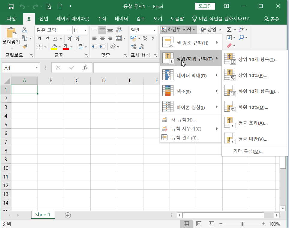 (2) 상위/하위 규칙 : 상위나 하위 기준으로 특정 범위의 값 또는 평균을 기준으로 데이트를 구분하여 특정한 서식을 표시하는 규칙