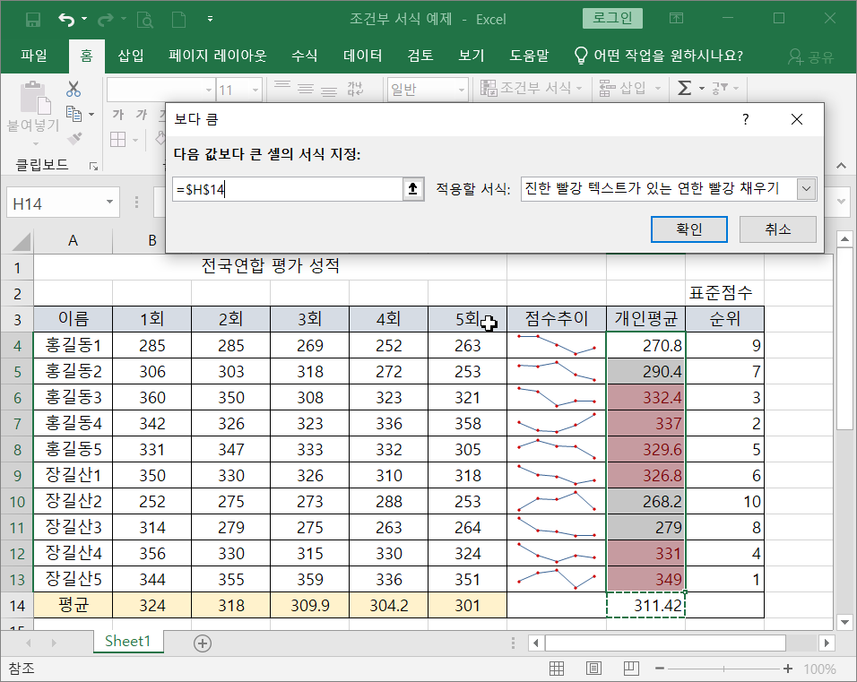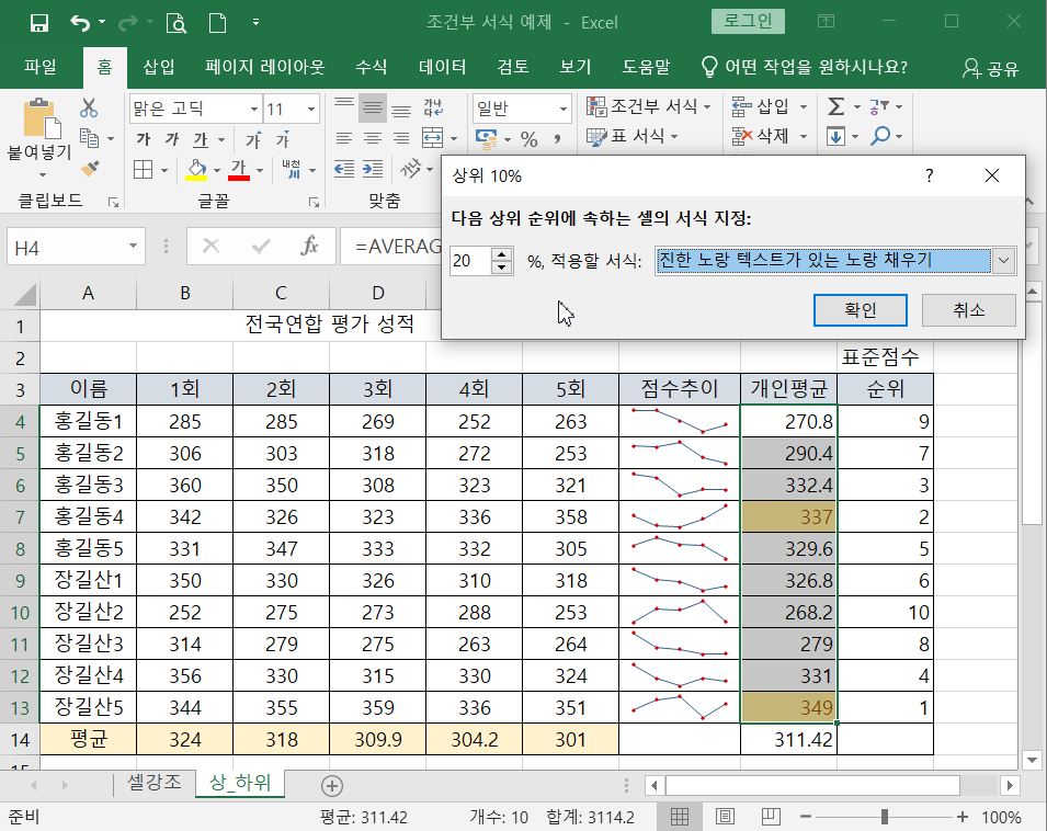 개인 평균값이 상위 20%에 해당되는 부분을 찾아 셀의 값과 셀의 색을 적용하자. 먼저 개인평균의 영역을 선택하고 (H4:H13) 리본메뉴 [홈]탭에서 [스타일]그룹 - [조건부 서식]-[상위/하위 규칙]-[상위 10%] 을 클릭하면 대화상자가 나타나고 조건에 맞는 값(20%)을 입력한다음 [적용할 서식]을 선택하여 [확인] 버튼을 클릭하면 적용됨.