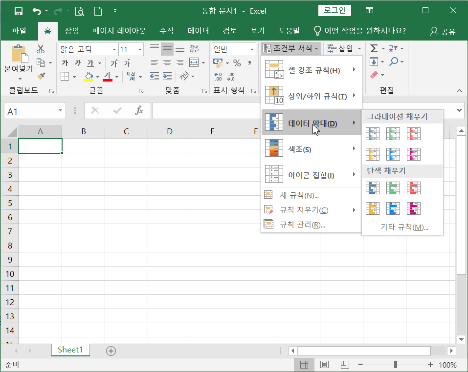 (3) 데이터 막대 : 여러 셀 값을 막대 그래프와 같은 모양으로 간단하게 비교하고 싶을 때 사용. 최댓값을 100%로 하여 막대의 길이가 길수록 높은 값을 나타내고 단색과 그라데이션 색상을 사용하여 나타냄.