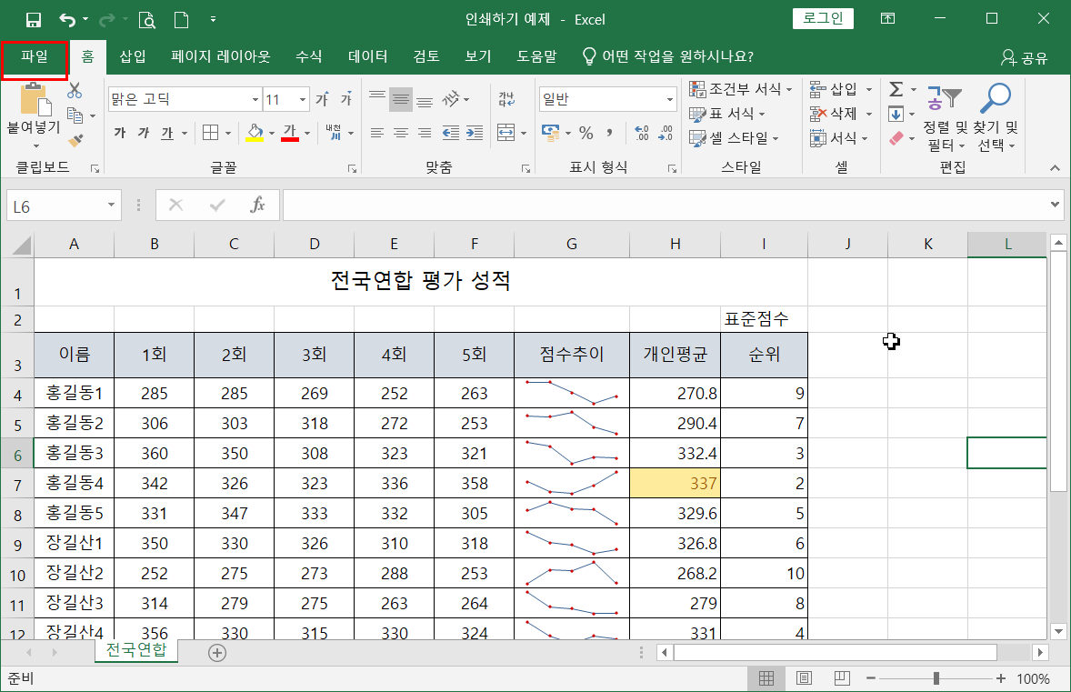 1. 데이터 입력 및 처리를 마쳤을 경우 리본 메뉴에서 [파일] 탭을 클릭한다.