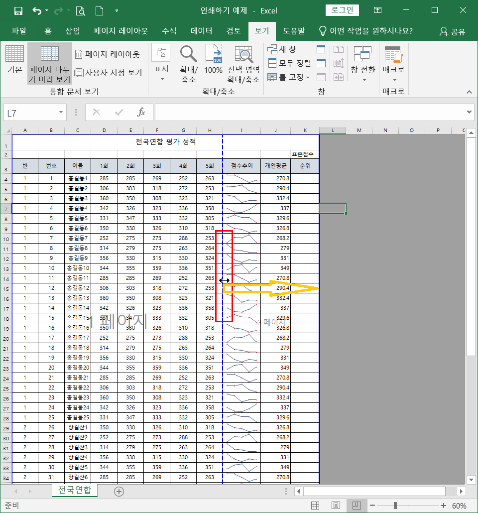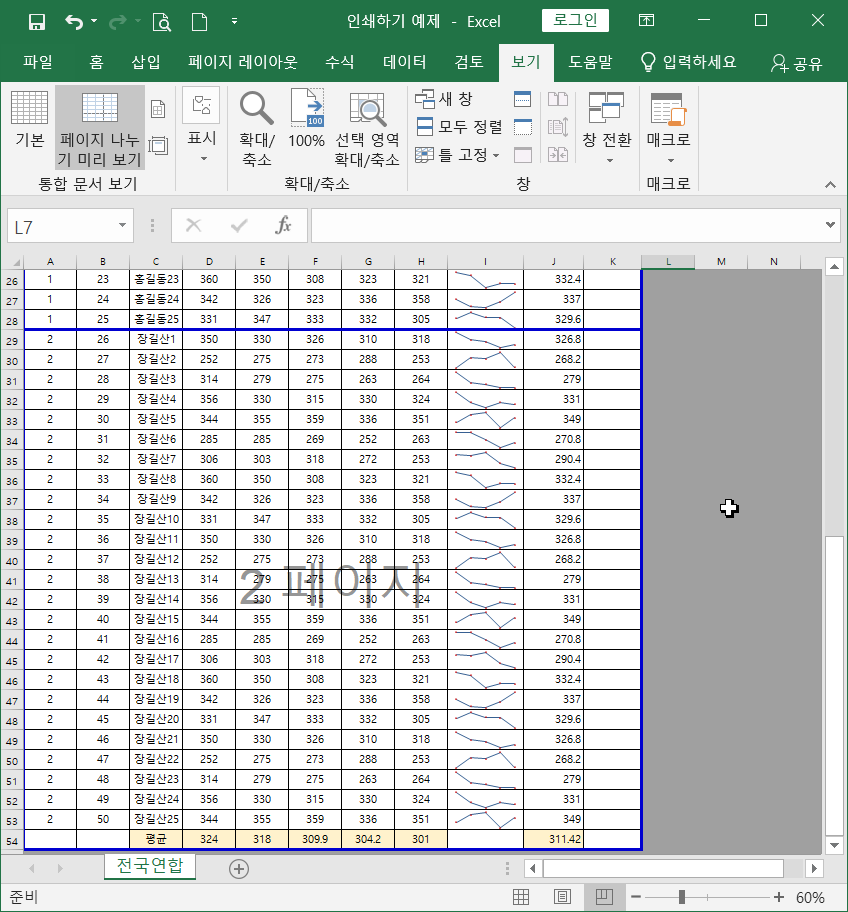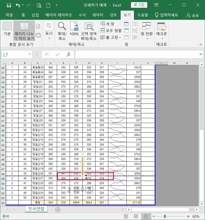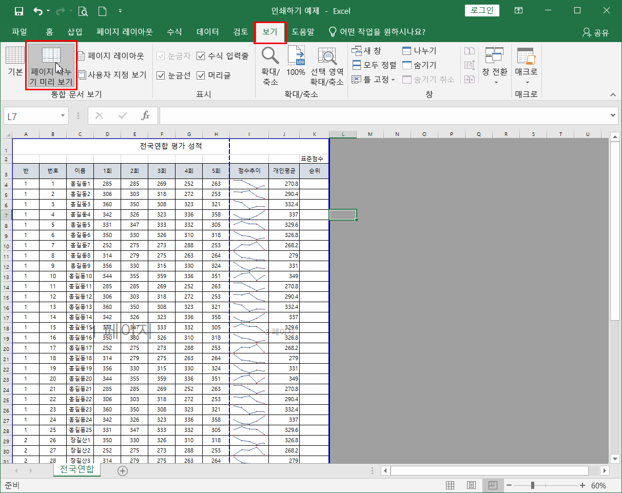 1. 리본 메뉴에서 [보기]탭 클릭후 [통합 문서 보기] 그룹에서 [페이지 나누기 미리 보기]를 클릭하면 파란선으로 인쇄되는 영역이 표시되고 페이지가 표시됩니다. 여기에서 인쇄 페이지를 마우스로 조절할 수 있습니다.