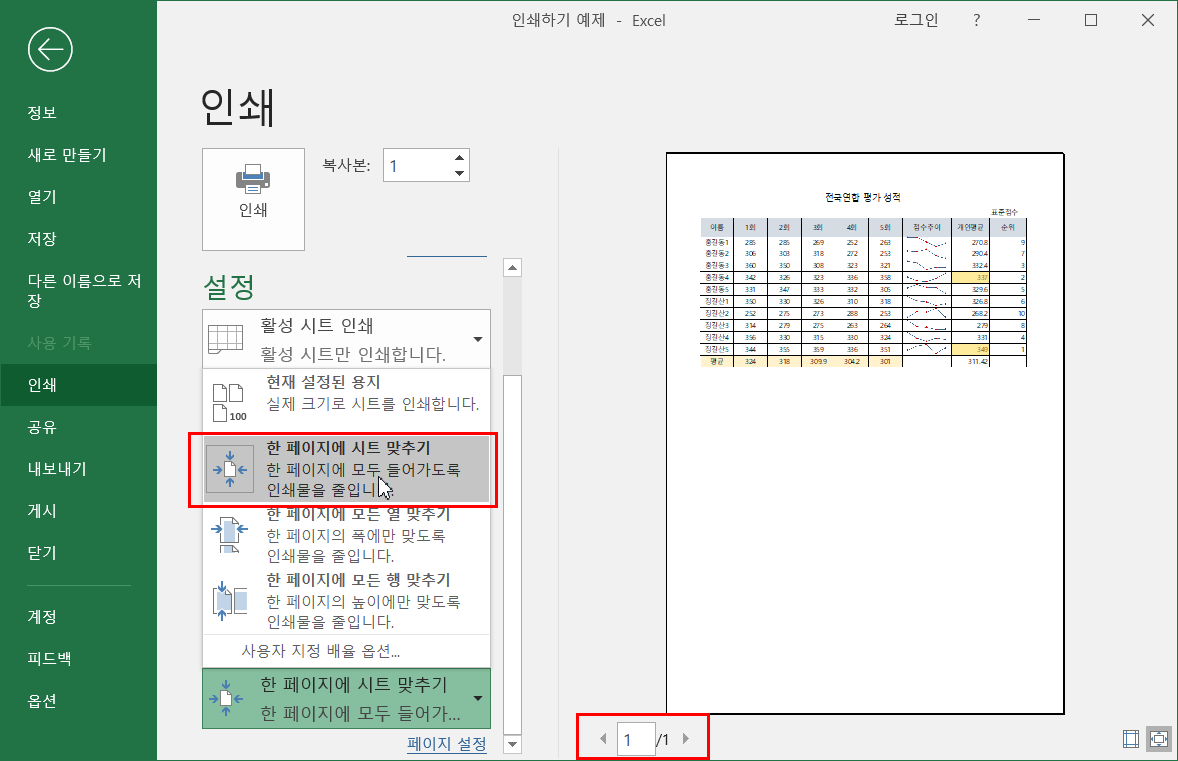 한 페이지에 시트 맞추기 위해서는 [설정]-[현재 설정된 용지]를 클릭하고 [한 페이지에 시트 맞추기]를 선택합니다. 그러면 한 페이지에 시트가 맞춰져 한장에 인쇄가 됩니다.
