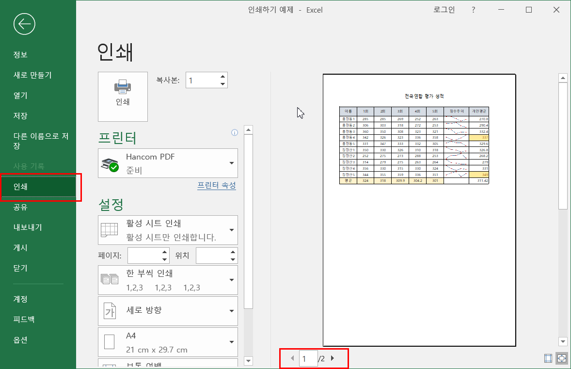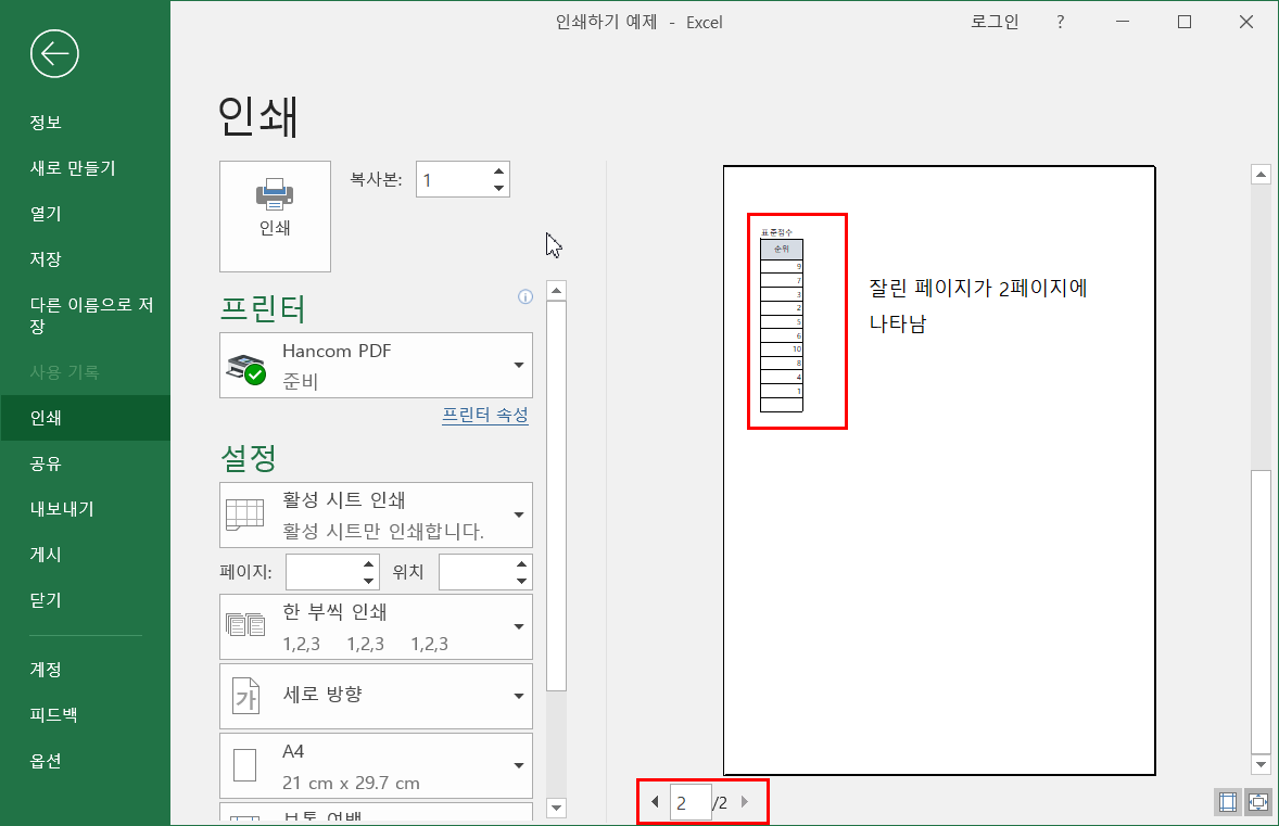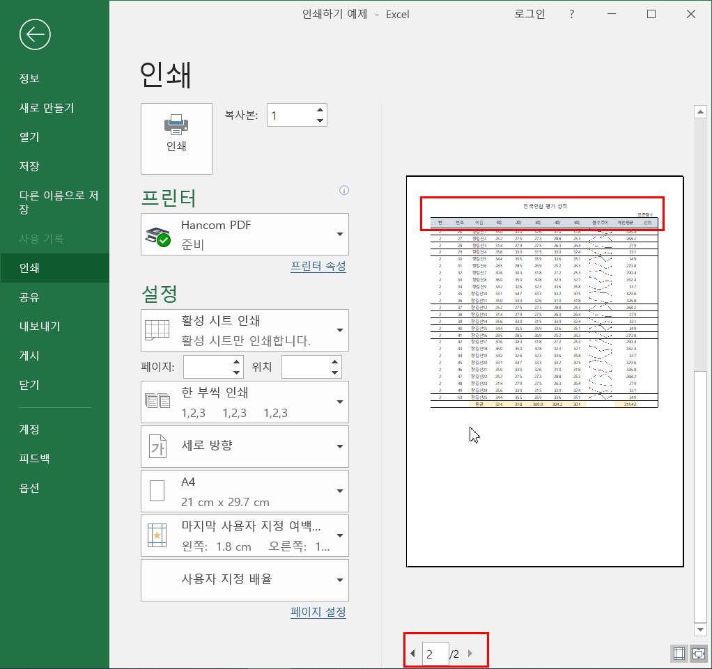 ■ 작업 시트에서 인쇄미리보기로 페이지 설정