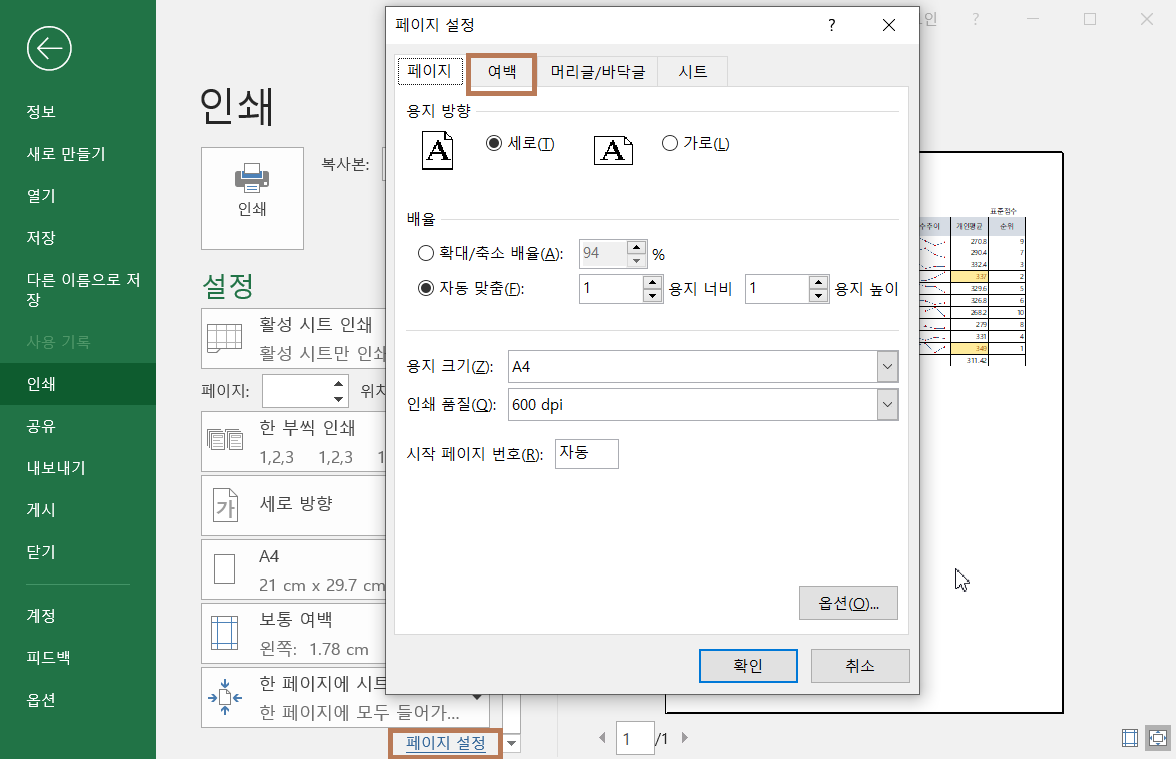 아래 [페이지 설정] 클릭 - 페이지 설정 대화상자가 나타나고 - [여백] 탭을 클릭합니다.