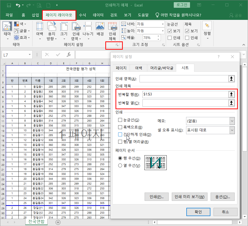 리본메뉴에서 [페이지 레이아웃]탭에서 [페이지 설정] 그룹에서 오른쪽 아래 화살표를 클릭해 [페이지 설정] 대화상자를 열고 [시트] 탭을 클릭합니다. 그리고 나서 [인쇄 제목]에서 [반복할 행]에 마우스로 선택하여 [확인]버튼을 클릭해 주면 인쇄시 페이지 만다 반복되어 목록이 나타나게 됩니다.