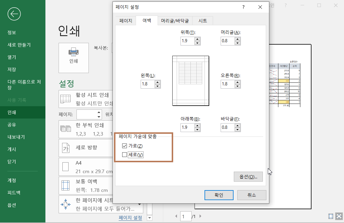 5. [페이지 가운데 맞춤]을 이용해서 [가로]에 체크하고 확인을 누르면 외쪽과 오른쪽 여백이 같게 되고 마지막으로 [인쇄]버튼을 클릭하여 인쇄합니다. 인쇄를 마치고 왼쪽 상단의 화살표 (←) 버튼을 클릭하여 [파일]탭을 닫으면 편집하는 시트로 돌아옵니다.