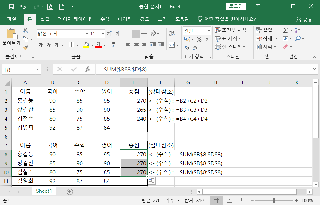 E8셀에 수식 '=SUM(B8:D8)'을 입력하고 B8에 마우스를 놓고 F4키를 눌러주고 D8에 놓고 F4키를 눌러주면 '=SUM($B$8:$D$8)'으로 절대참조로 변경됩니다. 이를 E8, E9셀에 복사하면 (Ctrl+드래그) 절대참조한 셀이 고정되어 결과 같이 달라지지 않고 그대로 있습니다. 절대참조 사용은 셀의 위치를 변경시키지 않아야 할 경우 사용하시면 됩니다.
