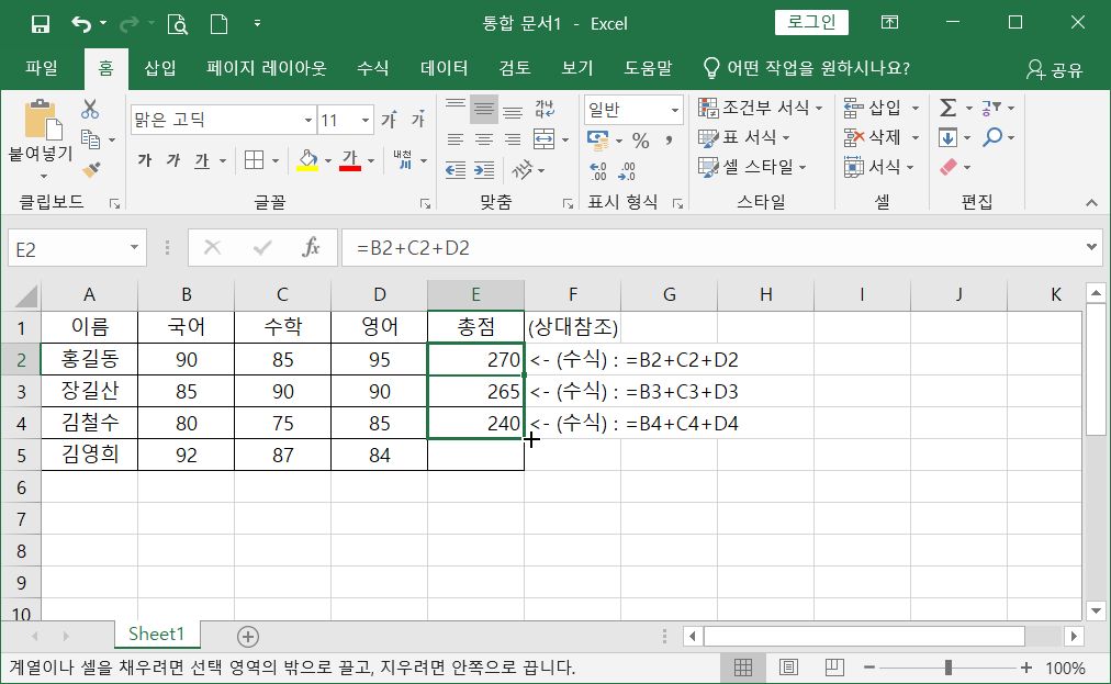 E2셀의 수식 '=B2+C2+D2'를 입력하고 E3, E4로 드래그 복사하면 E3:=B3+C3+D3이 되고 E4:=B4+C4+D4가 되어 참조하는 셀의 위치가 자동적으로 변경되어 계산됩니다. 각 학생별로 총점을 계산하기 위해서는 상대참조를 사용해야 구할 수 있습니다.