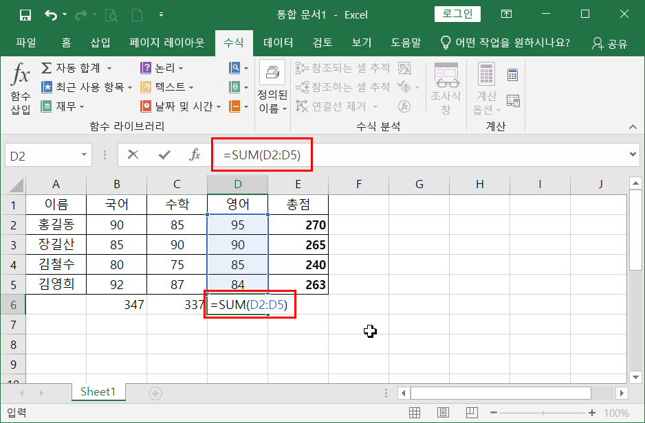 - 선택영역의 합이 계산됨 (=SUM(B2:B5) )
