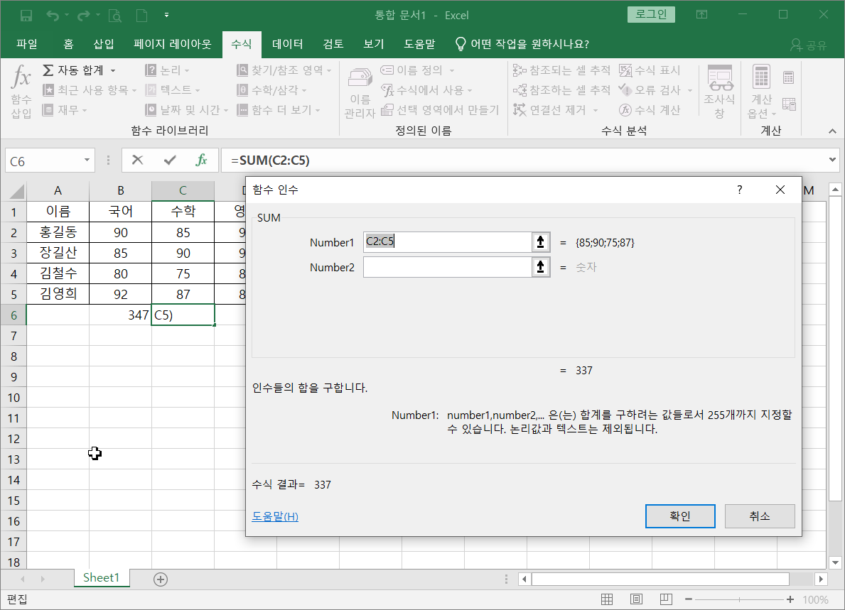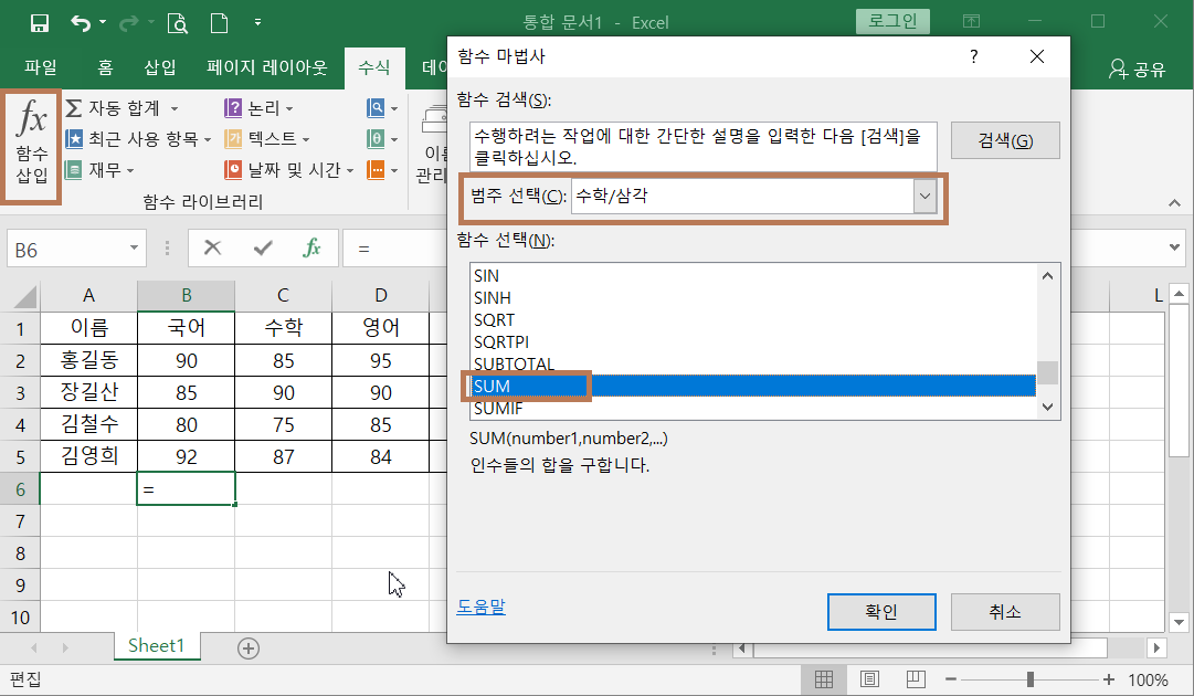 - [함수 선택]에서 [SUM]을 클릭후 [확인]을 클릭함
