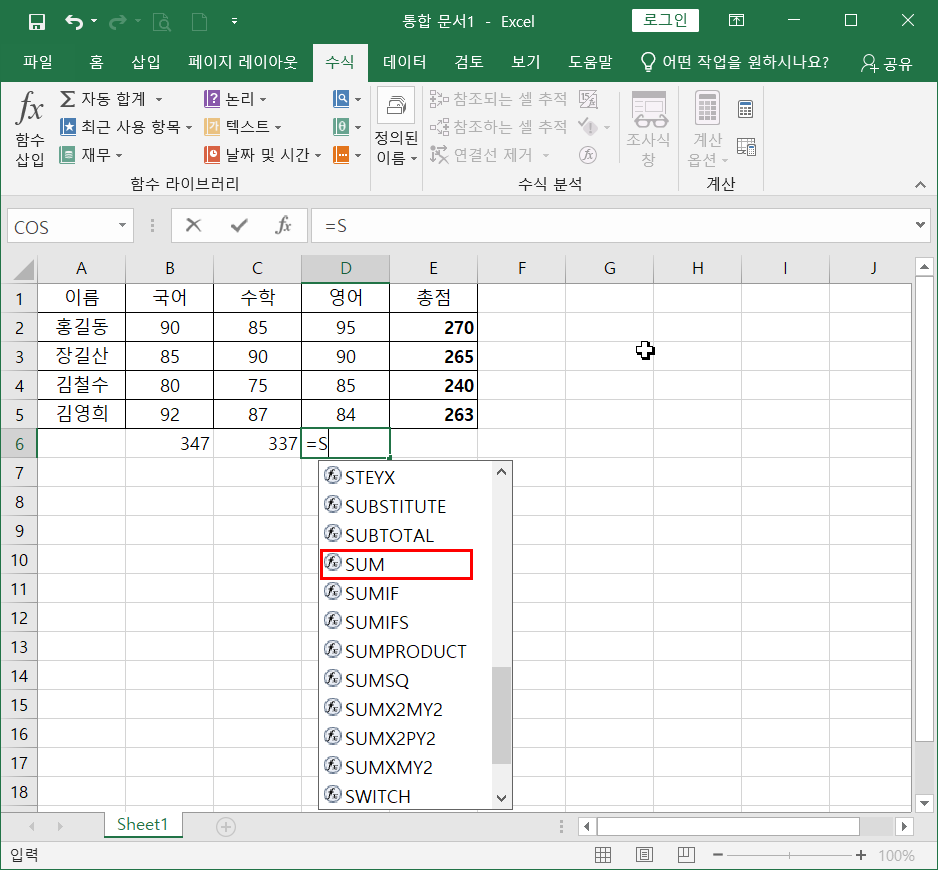 - '=S'를 입력하면 S로 시작하는 함수 목록이 나타남