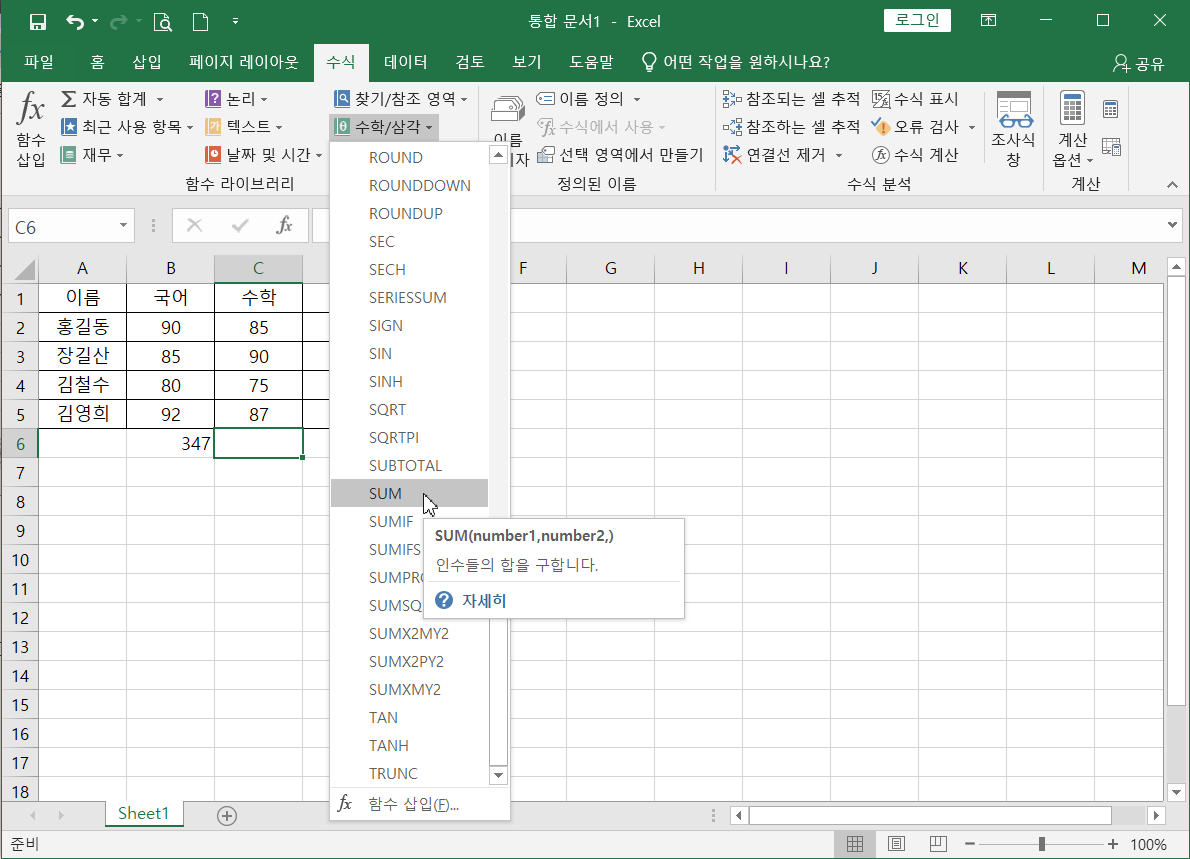 - 리본메뉴 [수식]탭의 [함수 라이브러리]그룹에서 직접 함수 선택 [수학/삼각]-[SUM]