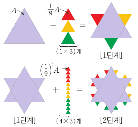 처음 정삼각형의 넓이를 A라 하고 [1단계]에서 늘어나는 부분의 넓이는