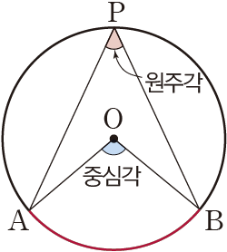 1) 원 O에서 호 AB를 제외한 원 위에 한 점 P가 있을 때, $\angle APB $를 호 AB에 대한 원주각이라고 한다.
